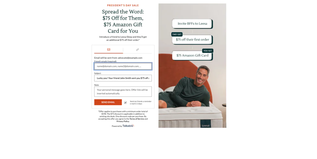 Leesa’s President’s Day referral setup is strong for one big reason: the value is obvious. Both sides get $75. No weird math. No tiny-print reward structure. No mental overhead. Mattress shopping already comes with enough hesitation. A referral offer should remove friction, not add more of it.