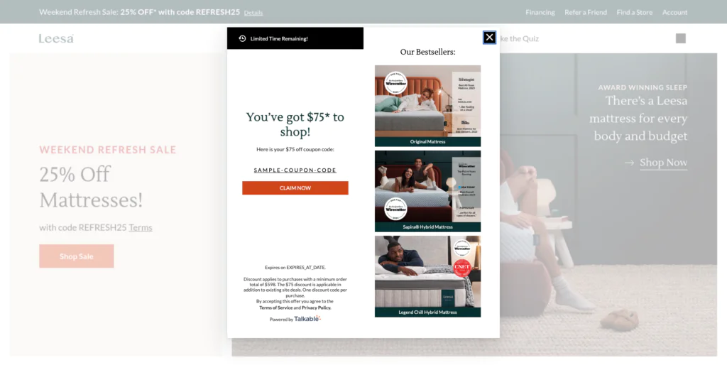 The last piece is the claim page. This is where seasonal campaigns often get messy. Too many banners. Too many exceptions. Too many competing messages. Leesa keeps the page focused on the action that matters: claim the offer and keep moving.
