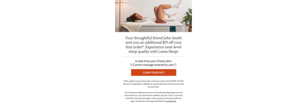 The best thing about referrals is that they start with a real person. Do not lose that in the email or landing page. Leesa keeps the personal context visible, which is a big part of why the campaign feels credible.