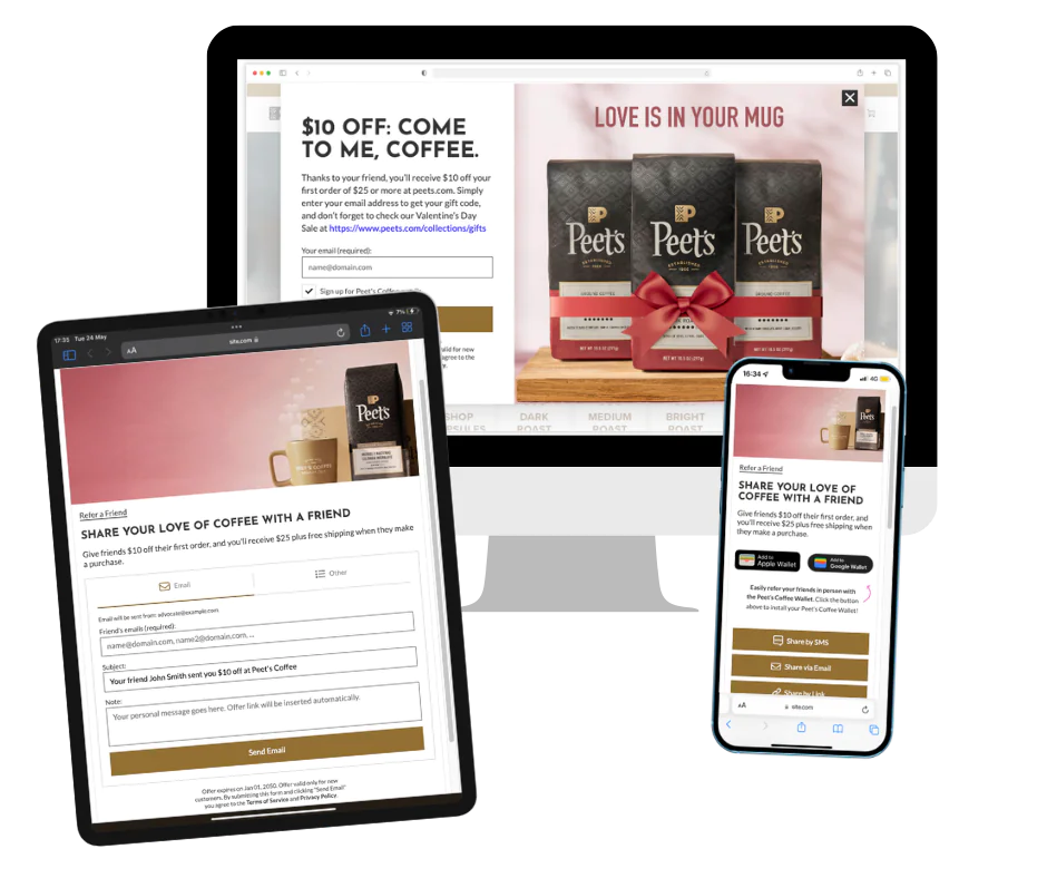 5. Cross-sell within the referral experience. RTIC’s bundle deals and Peet’s Valentine’s gift collection turn the referral landing page into a merchandising opportunity. The friend isn’t just landing on a generic discount page. They’re discovering curated, seasonally relevant products that increase the likelihood of conversion and boost AOV.