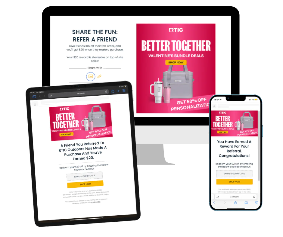 RTIC didn’t just add hearts to their existing referral program. They built their entire Valentine’s campaign around a product strategy, “Better Together” bundle deals paired with 50% off personalization, and then wove the referral program directly into it. The result is a campaign where sharing feels like sharing an experience, not forwarding a coupon.