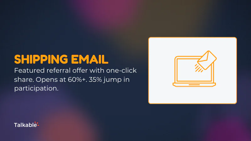 Shipping notifications open at 60%+ on average, making them one of the highest-engagement emails you’ll ever send. Customers are tracking their package with anticipation, and that positive emotional state makes them significantly more receptive to sharing. Brands that embed a featured referral offer with a one-click share option in their shipping emails see a 35% jump in referral participation.