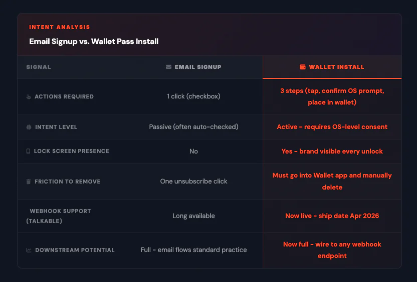 Installing a wallet pass is a voluntary, intentional commitment that happens inside the OS itself. It is harder to do and harder to undo than subscribing to an email list. That signal deserves better than a single default welcome email.