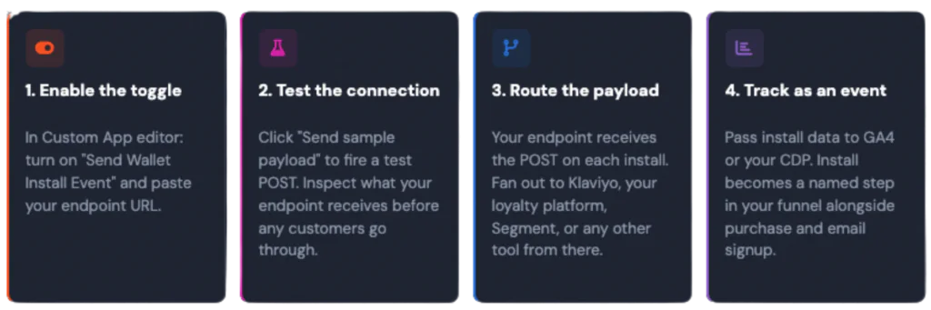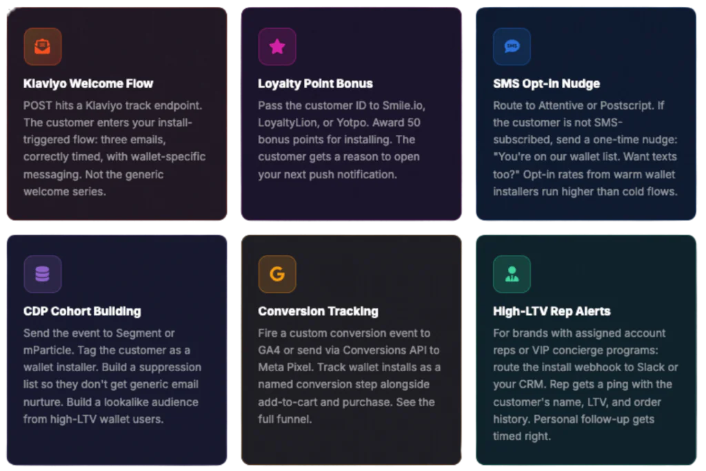 This needs to change, and now it can. Talkable just shipped a post-install webhook event in the Custom App. When someone installs your wallet pass, a POST request fires to any endpoint you choose. That single event can trigger a Klaviyo welcome flow, award loyalty points, nudge an SMS opt-in, feed a CDP segment, or ping your rep for a high-LTV account. All of it automatic, all of it in real time.