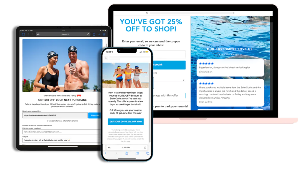 SwimOutlet partnered with Talkable to implement a scalable, fully managed referral acquisition program designed to convert their large base of loyal customers into a predictable stream of new customers. The strategy focused on increasing touchpoint coverage with optimized post-purchase placements, dashboard widgets, and on-site referral pages to ensure more customers actually see the referral offer. Talkable launched structured A/B tests on CTAs, incentive types, and placement performance to identify what resonated most with SwimOutlet’s audience. The always-on program was supplemented by seasonal boosts around peak swim seasons, with fraud protection to safeguard margins and detailed funnel analytics to help identify optimization opportunities.