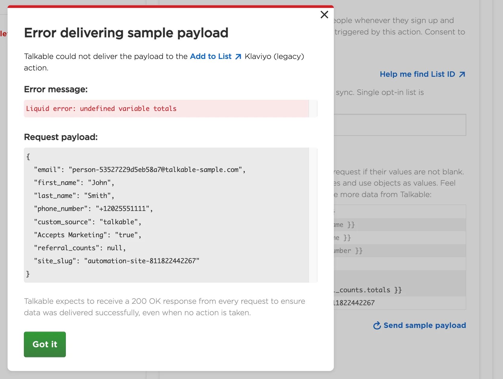 Setting up and testing App Store integrations should feel straightforward—not like guesswork. That’s why we’ve improved the Send Sample Payload experience to give you clearer feedback when validating your App Store actions. When sending a sample request, Talkable now actively c...