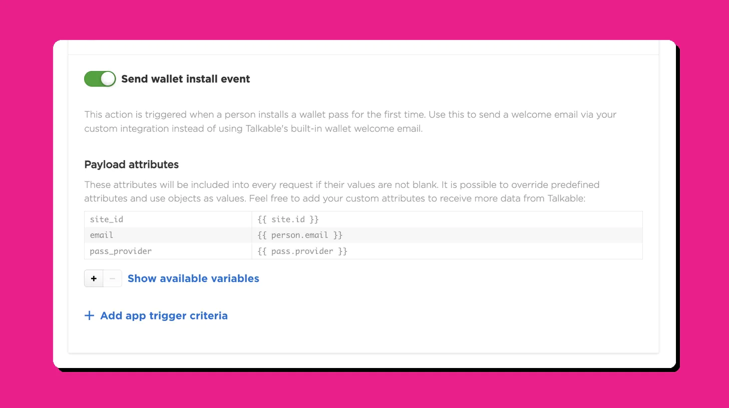 A Wallet pass install is a high-intent moment — but until now, you had no way to act on it. When a customer added your brand’s pass to their phone, Talkable sent them a welcome email by default. But there was no way to fire additional downstream automations — like a Klaviyo ...
